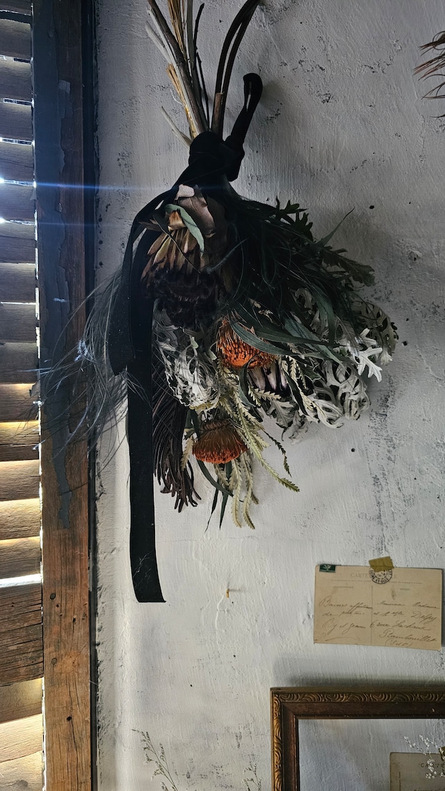 ●こちらはオーダー品です。 ●11/15以降発送予定です。 ●オーダーのため写真と少し異なる場合が ございます。予めご理解の上ご注文ください。 ●アトリエで受け取り希望の方はInstagramの DMからご連絡ください。 ベースのグリーンは生花でのお届けです。 他の材料はドライ状態のお届けとなります。 海外の写真などで見るような 枝など経年劣化を思わせる 雰囲気ある朽ちた素材でおまとめしています。 カリグラフィーの手描きのタグ付きです。 ■サイズ リースの直径 約30cm 全体(枝やツルを含む)の長さ 約50cm 全体の幅 約35cm 壁掛け用のワイヤーが付いています。
