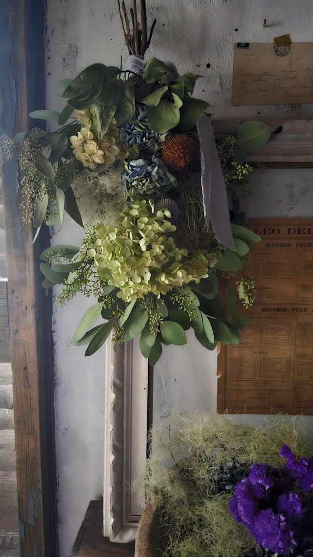 グリーンとパープルの色合いで 爽やかにまとめています。 アジサイ、アンティチョーク、柏葉アジサイ、 ユーカリ、ビルベリーなど使っています。 フレームやハガキなどと一緒に飾って 頂くと雰囲気がでます。 ■サイズ 長さ約50cm 幅約15cm