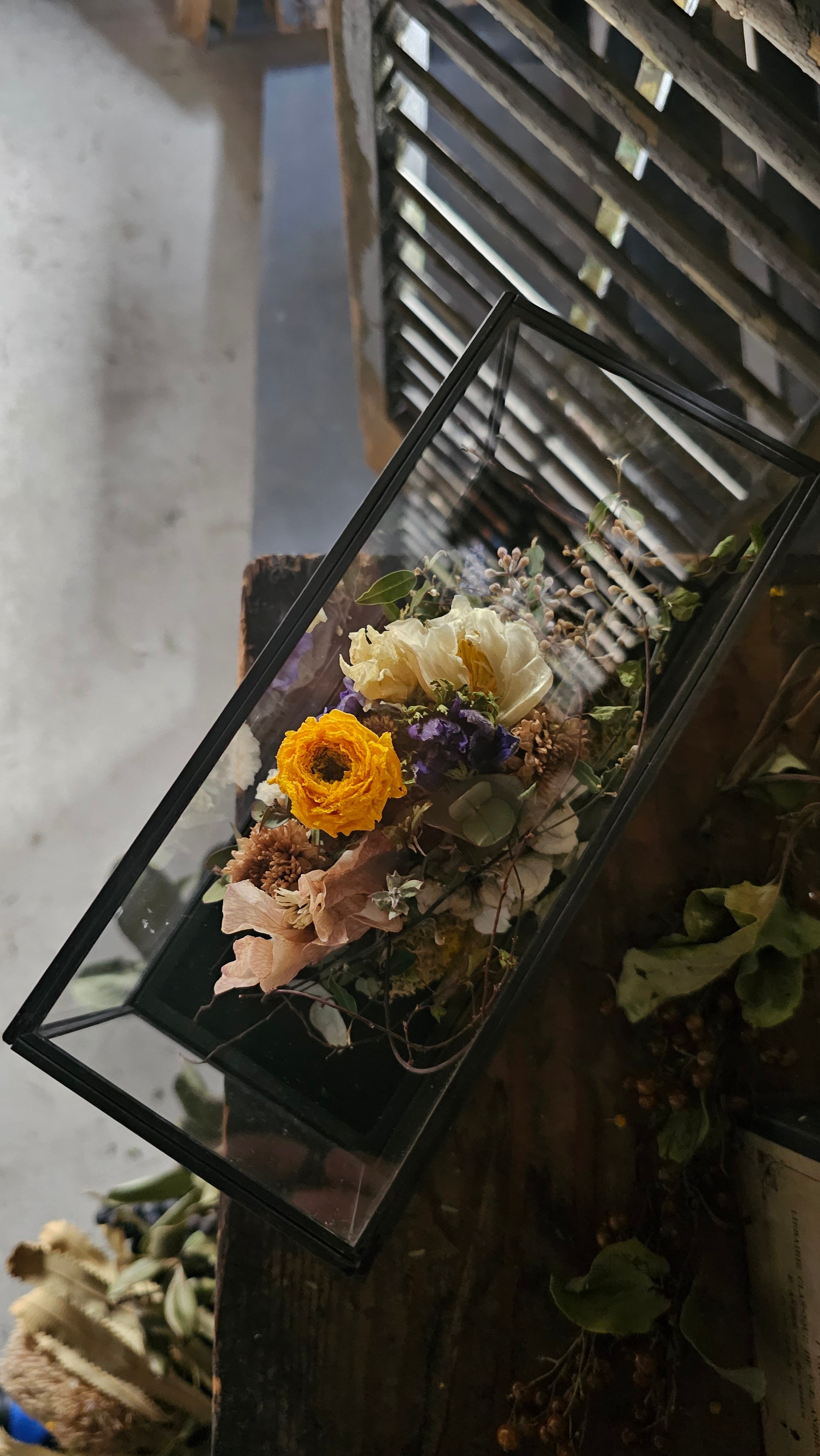 春の繊細なお花をガラスケースに閉じ込めました。