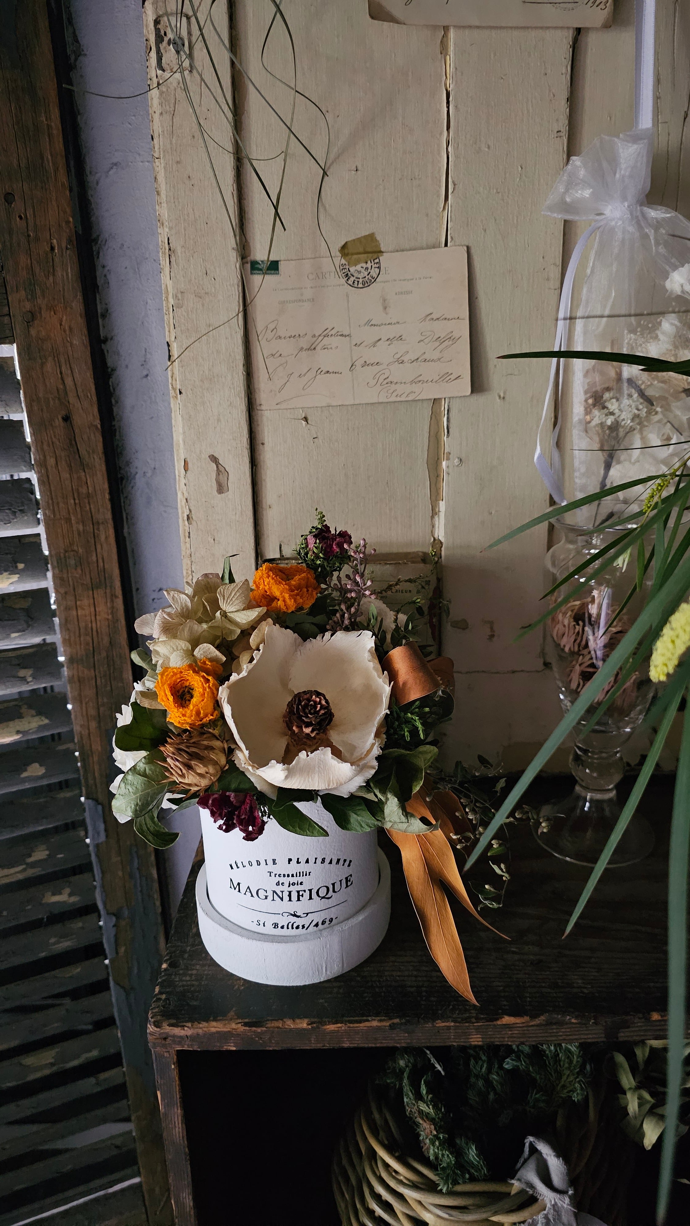 すべてドライフラワーとプリザーブドフラワーで作っているので長くお楽しみいただけます。
